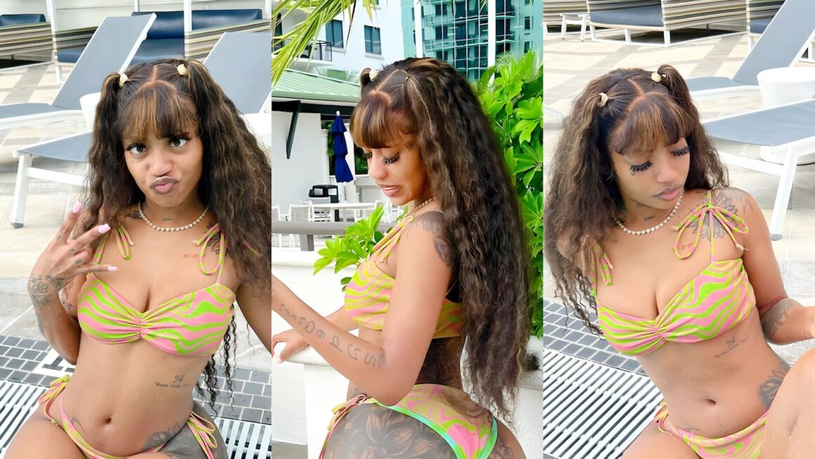 The Dancehall artist on Wednesday (April 6) took to social media to flaunt her figure in a shocking green and pink two-piece swimsuit at the poolside.